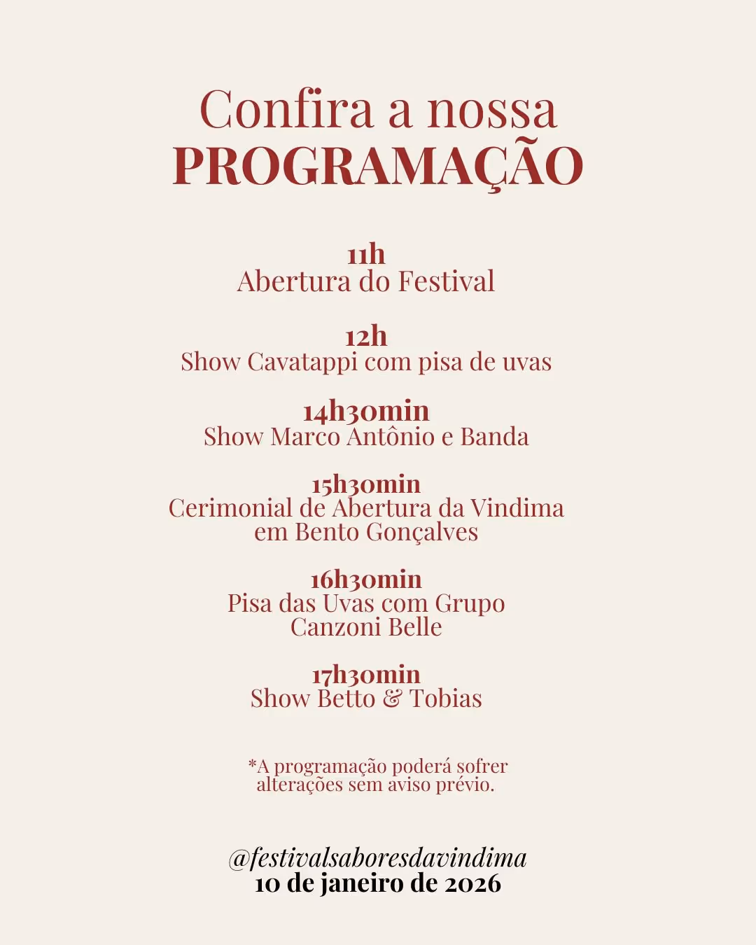 A Vindima de Bento acontece de 10 de janeiro a 29 de março, e a programação é espalhada pelas principais rotas turísticas do município. A abertura oficial ocorre neste sábado (10), junto ao Festival Sabores da Vindima, na Vinícola Salton no distrito de Tuiuty.